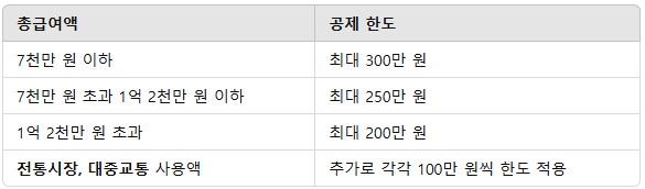 - 공제 한도는 총급여에 따라서 다르고 300만원에서 700만원까지 적용이 됩니다.