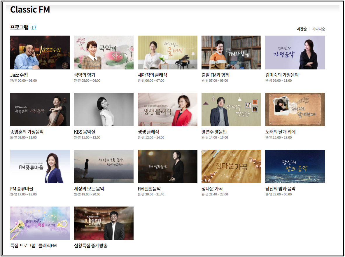 해당 편성표들은 위에 말씀드린 클래식 라디오 주파수를 통하여 들으실 수 있으며, 자세한 편성표 시간등은 아래 이미지를 보시면서 확인하시면 될듯 합니다. 이외에도 kbs 라디오는 다양한 프로그램들이 존재 합니다. 해피fm, 1라디오, 쿨fm 등 다양한 프로그램들이 있어 kbs 라디오 홈페이지로 들어가셔서 좀더 자세히 확인하고 해당 시간에 라디오를 들으시면 될듯 합니다.
