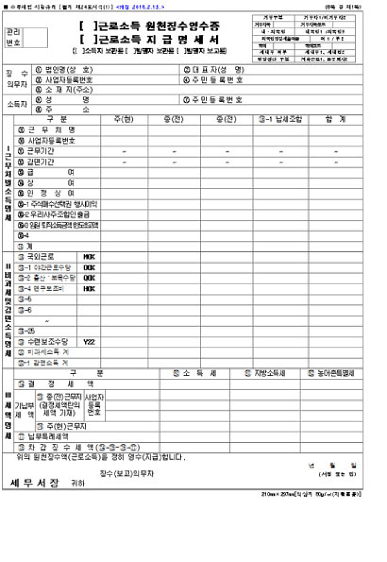 내용은 [안녕하세요. 20xx년 x월에 퇴사한 김 아무개 입니다. 타회사 입사 예정으로 원천징수영수증 발급이 필요합니다. 00년 00월 00일 ~ 00년도까지의 원천징수영수증을 발급하여 메일로 보내 주시시길 요청드립니다.]