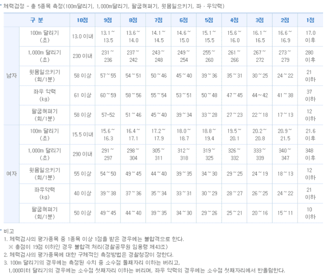 그리고 경찰되는법의 체력시험으로는 5가지가 있습니다. [100m달리기, 1000m달리기, 윗몸일으키기, 좌우악력, 팔굽혀펴기] 이렇게 5가지의 체력평가들 중에서 1종목 이상 1점을 받게 된다면 불합격된다고 합니다. 총합이 19점 이하라면 불합격되는 부분입니다. 체력평가를 마치고 마지막으로 경찰되는법에서는 면접시험이 남아있습니다. 면접은 최종합격자 결정의 25%의 비중을 차지하고 있고 총점 40%이상의 드점ㅈ로써 합격자로 선발되게 됩니다. 면접시험은 {1단계 집단면접 / 2단계 개별면접] 이렇게 진행됩니다. 2단계때는 신분증, 응시표, 손수건만 필요합니다. 마지막 가산점으로는 5%의 가산점이 있습니다. 이것은 면접시험에서 발생되는 부분입니다. 이 가산점은 자격증으로 면접시험에서 5점까지 점수를 인정받을 수 있는 동일 분야에서의 점수가 높은 자격증 하나만 인정된다고 합니다. 지금까지 말한것이 경찰되는법 공채, 특채로 진해하는 것이고 경찰대학은 아주 다른 내용을 가지고 있습니다.